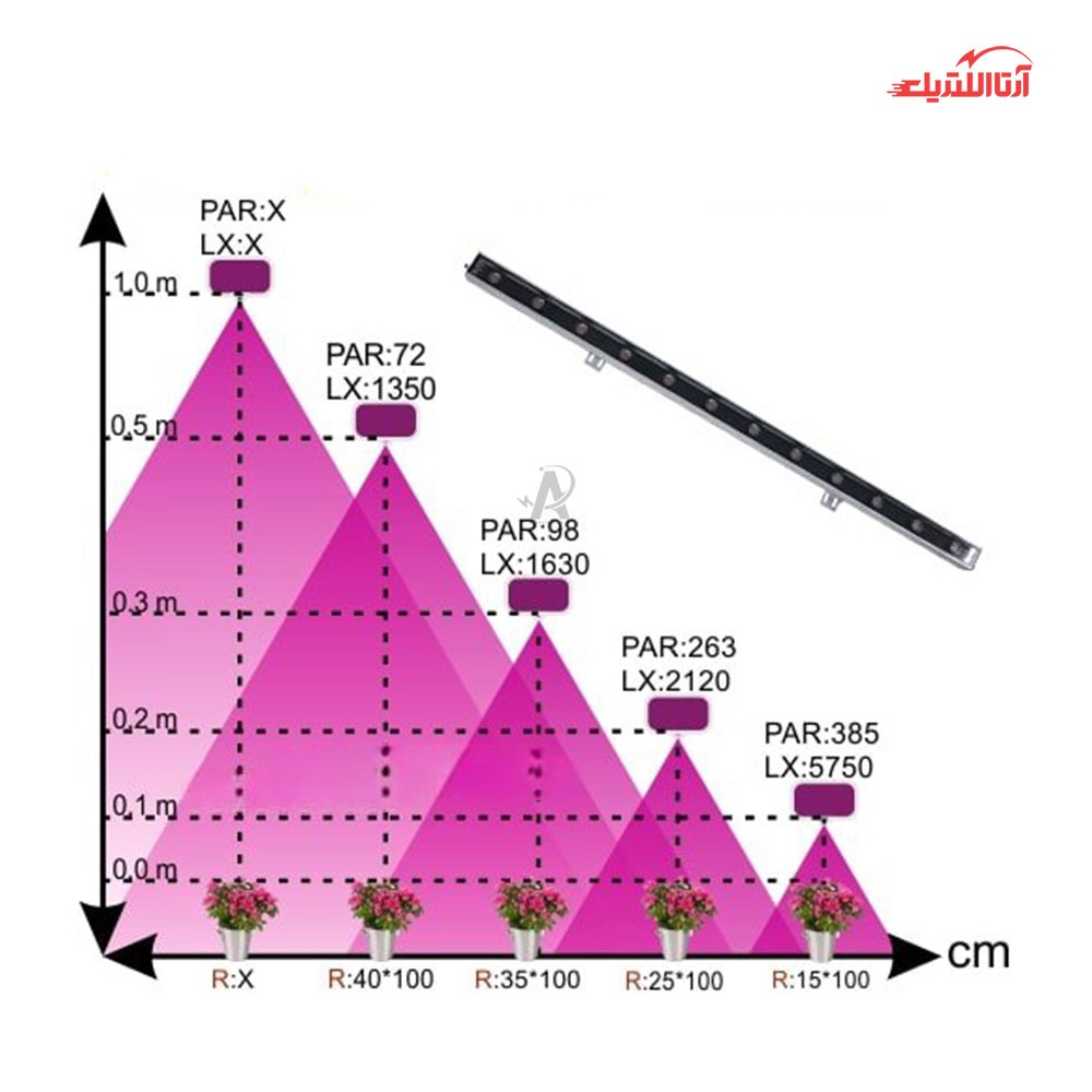 وال واشر مخصوص رشد گیاه 12 وات با نوردهی 90 لومن بر وات که در مجموع 1080 لومن نور در طیف 400 تا 700 نانومتر با ترکیبی از 4000 تا 5000 کلوین با طول عمر 50 هزار ساعت است. در تولید این چراغ از بهترین مارکهای نوع LED از رنگ نورهای قرمز و آبی ساخته شده تا بهترین بهرهنوری را ساطع کند. سطح تحت پوشش چراغ 110X50 سانتیمتر مربع است و برای نصب باید فاصله را از تاج گل محاسبه کرد که معمولا ارتفاع نصب با توجه به تعداد گیاه از 40 سانتیمتر در نظر گرفته میشود. محصولات رشد گیاه دارای درجه حفاظت IP برای جلوگیری از نفوذ رطوبت و گردوخاک و با استاندارد IR تولید میٰشوند که نشان از عدم تولید گرماست که برای گیاه مضرر است.